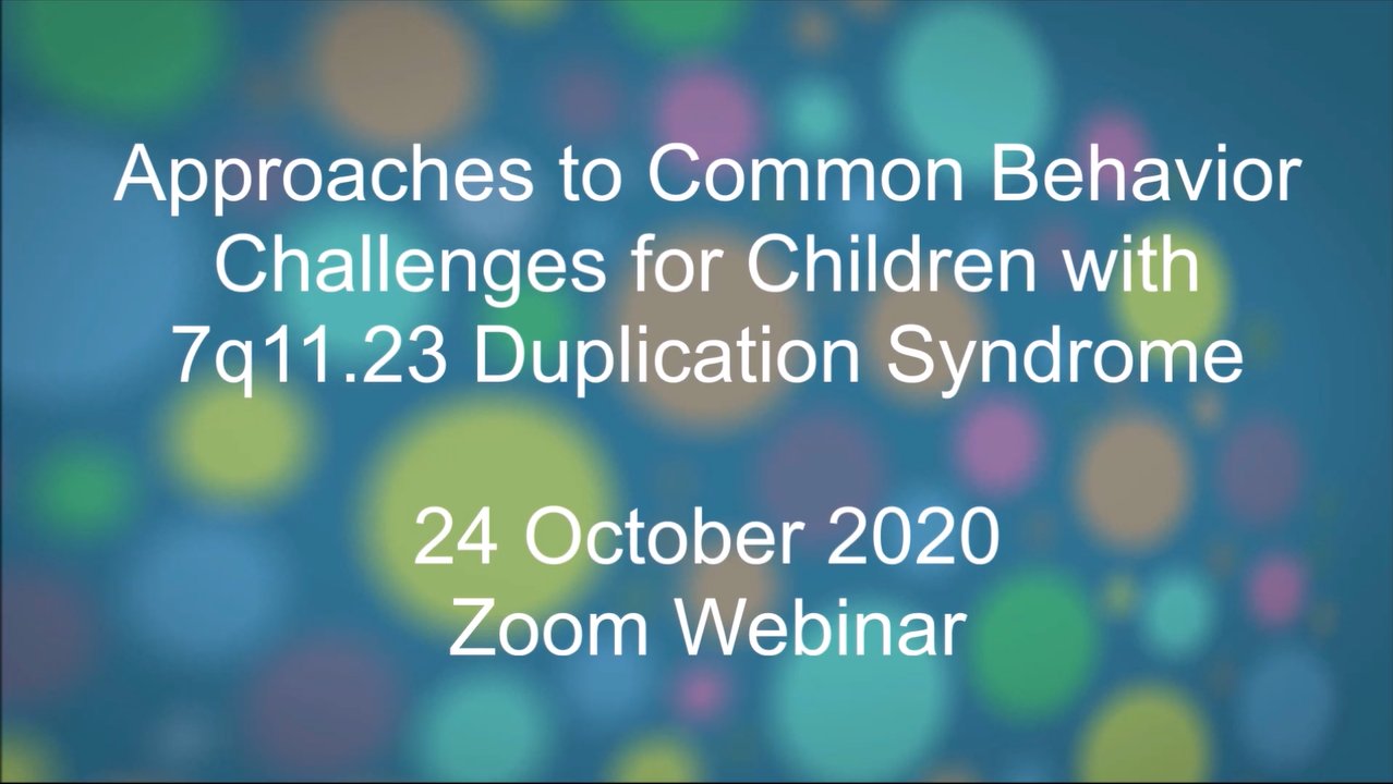 Bonnie Klein-Tasman, Ph.D. presents a Zoom webinar on the topic of approaches to common behavior challenges for children with 7q11.23 duplication syndrome. Dr. Klein-Tasman describes the kinds of behavioral and emotional challenges that are common in individuals with Dup7, based on current research, and suggests approaches for specific challenges. Presented on 24 October 2020 by Duplication Cares.
