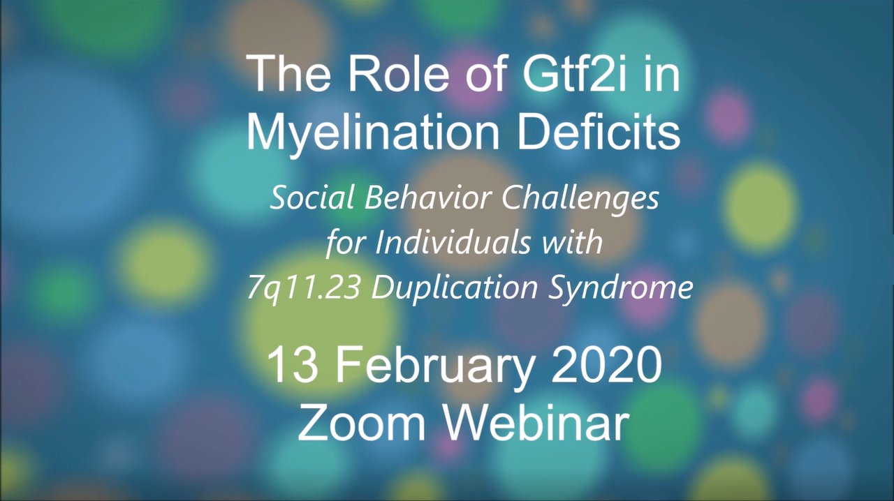 Dr. Boaz Barak of the Brain Behavior Lab, The School of Psychological Sciences and the Sagol School of Neuroscience, Tel Aviv University, Israel gives a detailed presentation on the role of Gtf2i in Myelination Deficits and its role in social behavior in individuals with 7q11.23 duplication. GTF2i (General Transcription Factor II-I) is a protein that in humans is encoded by the GTF2I gene. This gene encodes a multifunctional phosphoprotein with roles in transcription and signal transduction. It is deleted in Williams-Beuren syndrome, a multisystem developmental disorder caused by the deletion of contiguous genes at chromosome 7q11.23. It is duplicated in the 7q11.23 duplication syndrome. Dr. Barak leads a webinar providing a detailed insight into the effect of this protein on social behavior and members of the Dup7 community. Presented on 13 February 2021 by Duplication Cares.
