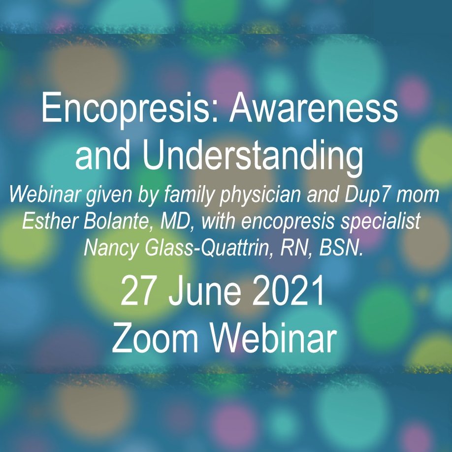 Webinar given by family physician and Dup7 mom Esther Bolante, MD, with encopresis specialist Nancy Glass-Quattrin, RN, BSN. Presented on 27 June 2021 by Duplication Cares